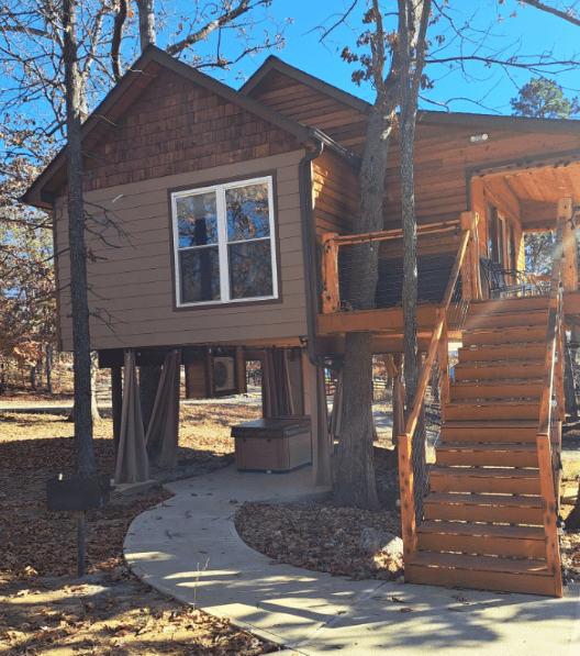 Amazing tree house right on Sayersbrook lake. You’ll have a hot tub, fireplace, huge deck, and yes, those views of the 60-acre lake!! Starting at $260+tax/night for 3 guests.